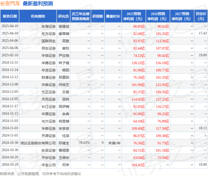 证券之星数据中心根据近三年发布的研报数据计算,信达证券股份有限公司邓健全研究员团队对该股研究较为深入,近三年预测准确度均值为78.62%,其预测2025年度归属净利润为盈利76.26亿,根据现价换算的预测PE为15.99。